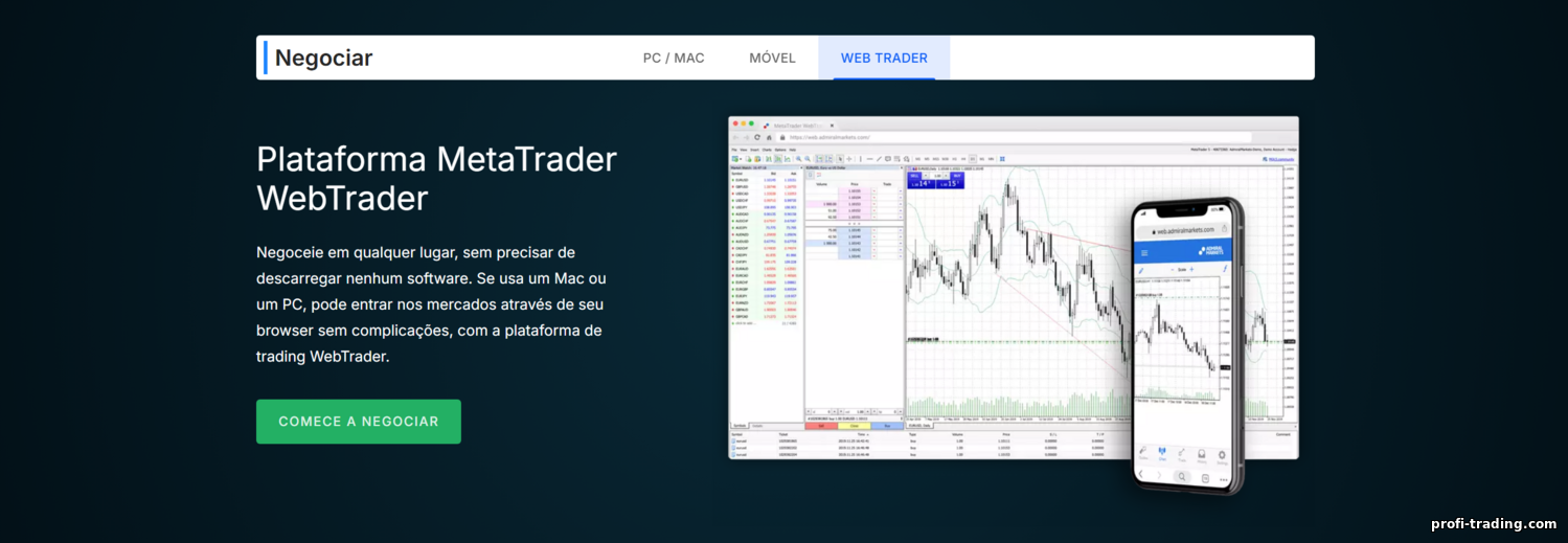 Para quem prefere o navegador, a Admirals fornece uma plataforma web proprietária com gráficos TradingView. Sem instalação. Pode analisar com as ferramentas ricas do TradingView e enviar ordens diretamente via Admirals. Cotações em tempo real, gráficos avançados, todos os tipos de ordens e gestão de conta (funding/levantamentos) estão disponíveis. As posições sincronizam entre plataformas — opere no MT5 em casa e mude para o web em viagem.