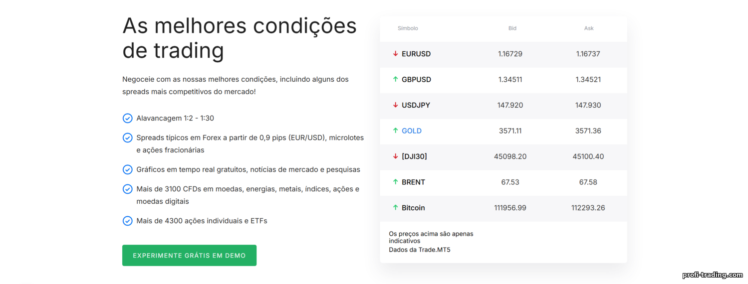 - Trade.MT5 — versão MT5 da Trade. Spreads flutuantes desde ~0,6–0,8 pips no EUR/USD, sem comissão em FX/índices, pequenas taxas em CFDs de ações. Depósito mínimo $100 (ou $25 fora da UE). Suporta leque mais amplo de instrumentos, incluindo ações/ETFs.