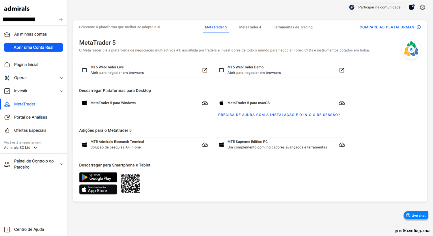 Note que todas as contas, exceto a Invest, negociam via CFDs. Mesmo ações ou obrigações são negociadas como CFDs com alavancagem, não como o ativo subjacente. A exceção é a Invest.MT5, onde compra ações/ETFs reais. Isto é padrão em muitas plataformas de negociação; a Admirals distingue‑se por oferecer também investimento real em ações.