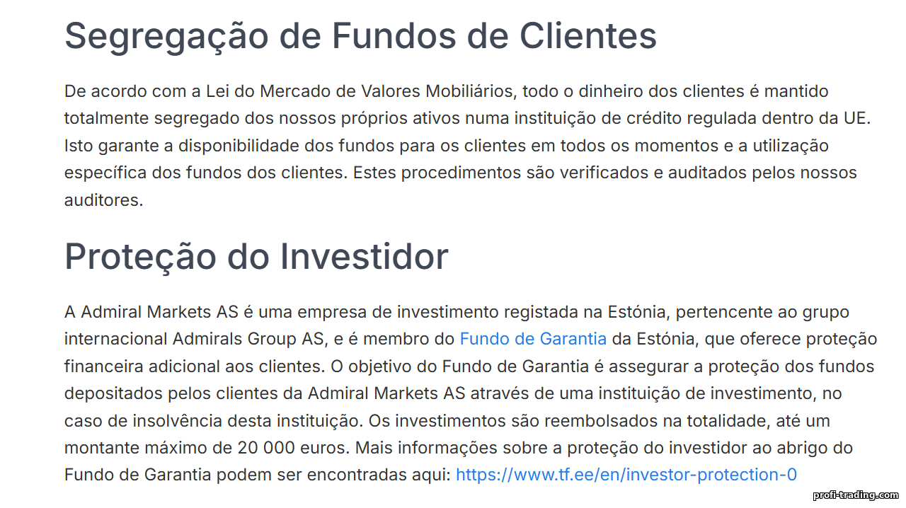 - Seguro de responsabilidade profissional. A Admirals assegura adicionalmente responsabilidade profissional até €100.000 por cliente com seguradoras reconhecidas (incluindo Lloyd’s of London), cobrindo certas perdas causadas por erro da corretora. Nem toda corretora oferece esta proteção.