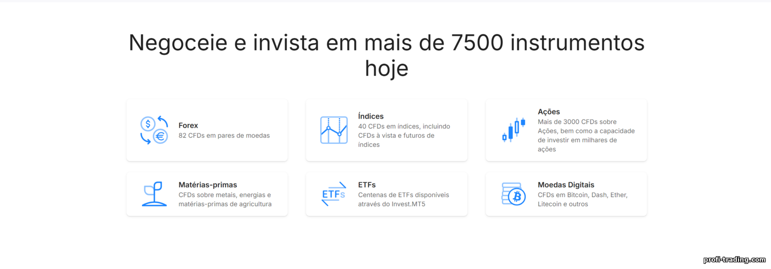 - Instrumentos disponíveis: 8.000+ — pares FX; CFDs sobre ações, índices, commodities, obrigações, criptomoedas, ETFs, etc.