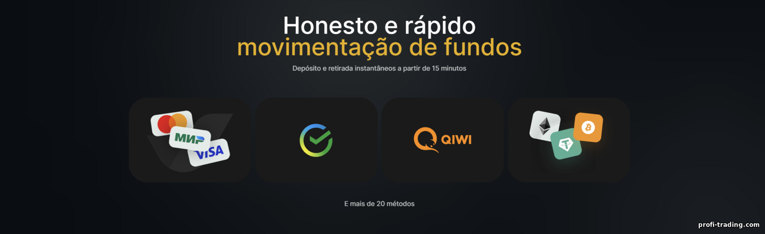Em resumo, um cliente russo pode depositar praticamente da forma que preferir. O depósito mínimo é 500 rublos (por qualquer canal). Depósitos via cartão e carteiras geralmente chegam instantaneamente ou em minutos. A corretora afirma não cobrar tarifas por entradas e até declara “sem taxas em todas as transferências e pagamentos”. Ainda assim, seu provedor de pagamento pode cobrar — p.ex., operadoras móveis ficam com uma parte, e carteiras podem cobrar para adicionar saldo. Isso foge ao controle da corretora.