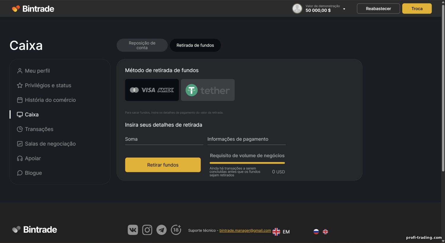 Processo de saque. Agora o ponto central — como receber. A BinTrade diz que você pode sacar lucros pelos mesmos meios usados no depósito: para um cartão, uma carteira digital ou um endereço de cripto. Regras padrão de AML se aplicam — os saques voltam para os mesmos dados usados ao adicionar fundos. Se você depositou via Visa, provavelmente poderá sacar de volta para esse mesmo Visa. Isso previne lavagem de dinheiro. Espere a exigência “origem = destino”, então escolha o método de depósito com isso em mente.