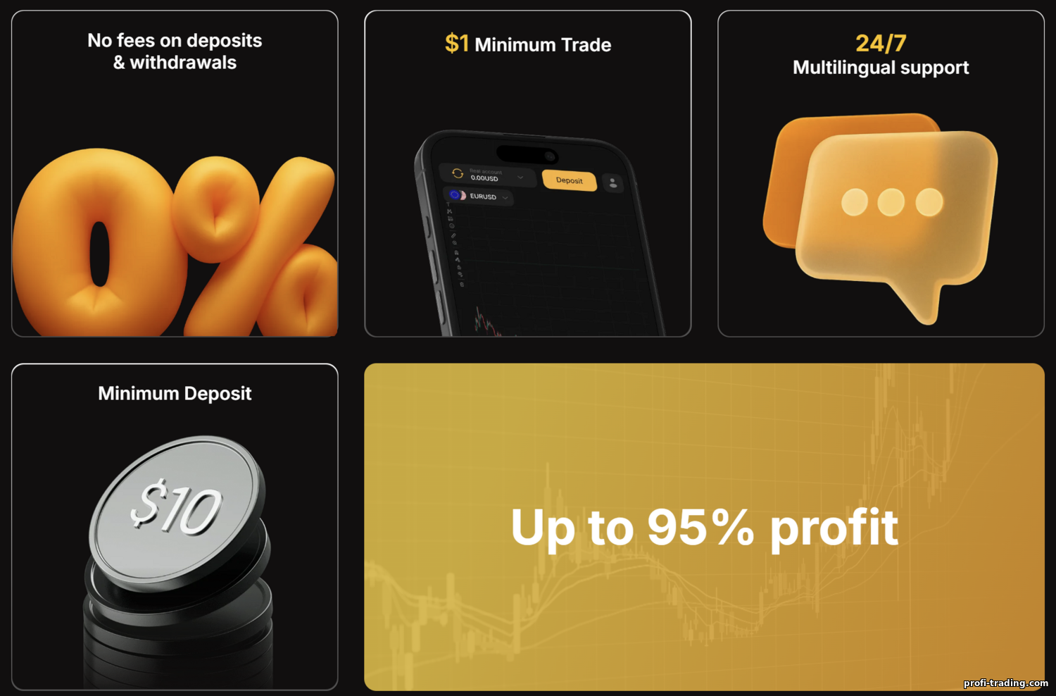 4. Custos diretos e condições claras. A Cronika afirma que não há comissões por operação — sem spreads e sem cobranças ocultas por opção. O que o trader paga é apenas o valor apostado (se perder, perde; se ganhar, recebe o valor de volta mais o lucro). O lucro é fixo: ~50% nos principais ativos e até 85% em algumas criptomoedas. Assim, você sabe o retorno potencial antes de abrir uma operação. Por exemplo, se você investir US$100 e acertar o movimento do mercado, recebe US$185 (US$85 de lucro líquido). Se errar, perde os US$100 apostados. Esse modelo é fácil de entender — sem coeficientes flutuantes e sem cálculos complexos. A Cronika também diz que não cobra taxa de inatividade (taxa de inatividade = US$0), então você não deveria ver descontos silenciosos se ficar um tempo sem operar. A corretora também não empurra bônus de forma agressiva, o que reduz o risco de regras de “giro de bônus” bloquearem saques — seus fundos não ficam presos a exigências de volume. A Cronika ainda destaca “Sem taxas em depósitos e saques”. Na prática, uma taxa de saque de 0,5% é frequentemente mencionada (veja a seção de saques), mas ainda é relativamente baixa. Para contas pequenas, a clareza de custos na Cronika é uma vantagem real: dá para operar valores modestos sem sentir que taxas vão consumir o saldo.