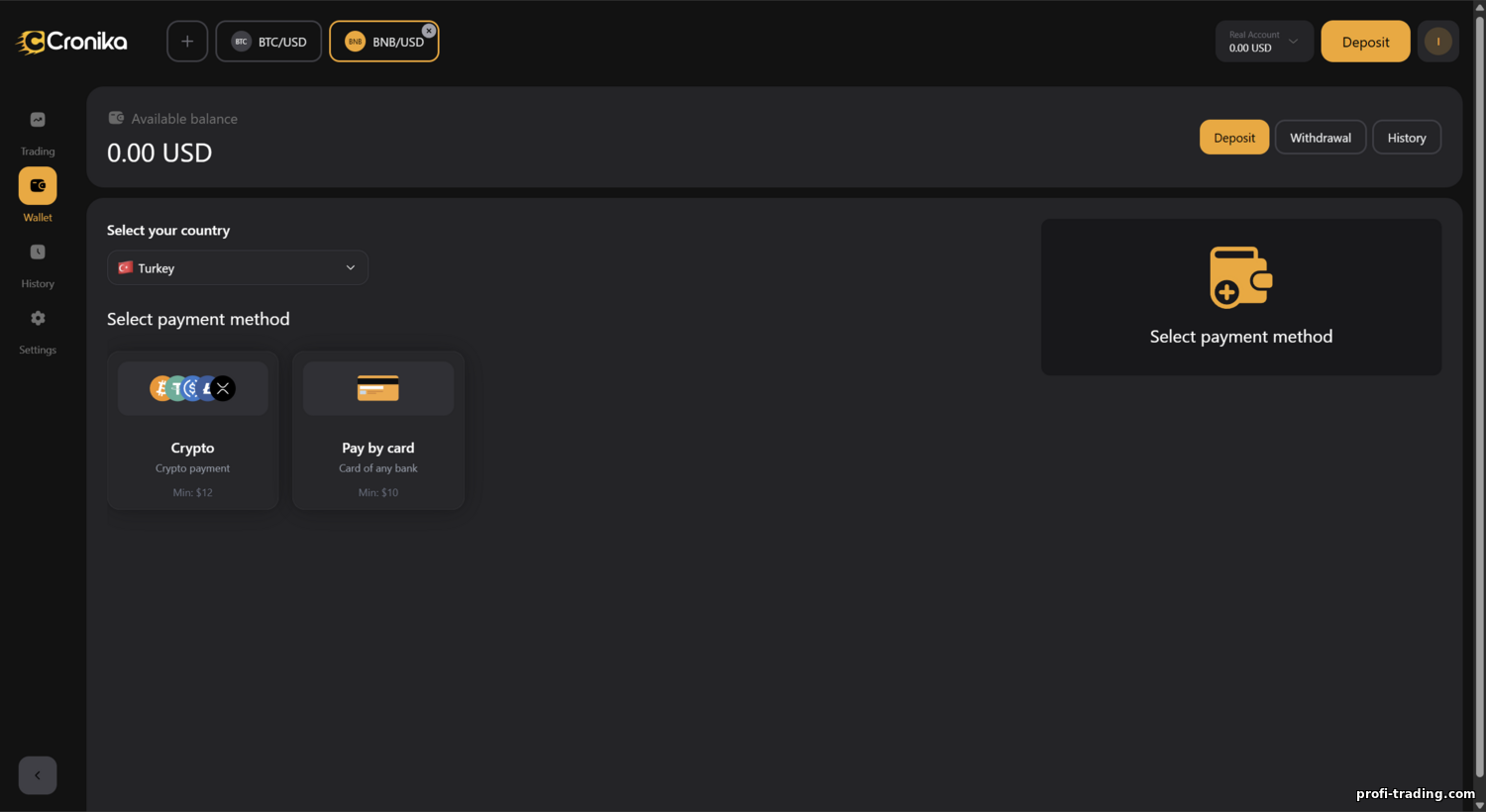 A Cronika é voltada para um início rápido para iniciantes: depósito mínimo de apenas US$10, uma conta demo gratuita de US$10000, operações a partir de US$1 e payouts de até 85% nas opções vencedoras. A corretora atende ativamente clientes de diferentes países, especialmente na Ásia e na CEI — contas em USD estão disponíveis com conversão de moedas locais (rupia paquistanesa PKR, rupia indiana INR, tenge cazaque KZT e outras). Ao mesmo tempo, usuários de alguns países não são atendidos (por exemplo, Estados Unidos, Rússia, Coreia do Norte, Palestina, Vaticano e outros aparecem na lista de restrições). O idioma oficial da plataforma é o inglês, e não há versões localizadas.