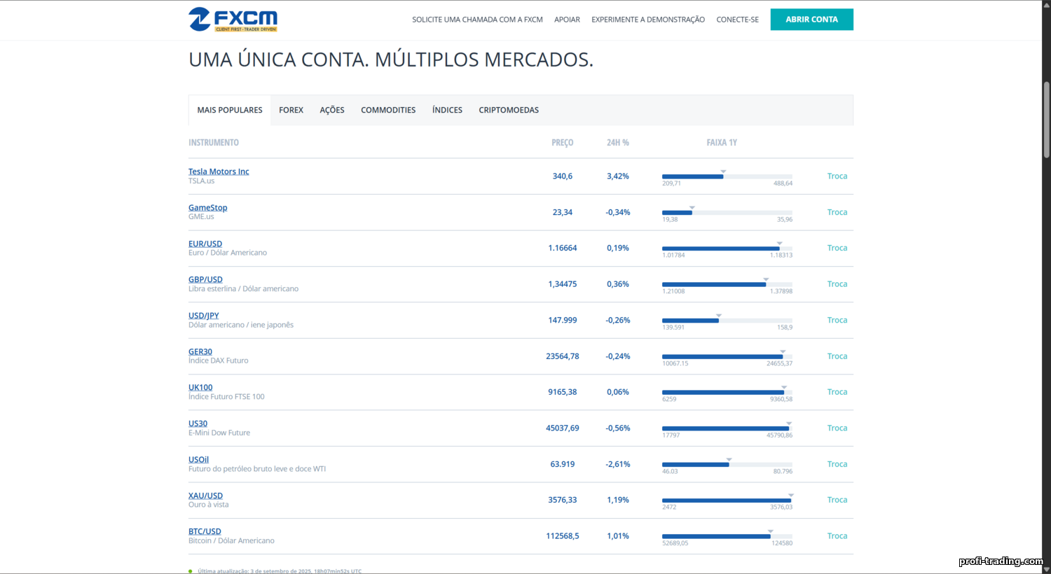 Veja o que é possível negociar na FXCM. A corretora é especializada em CFDs — contratos por diferença — permitindo especular sobre preços sem possuir os ativos. As categorias incluem: