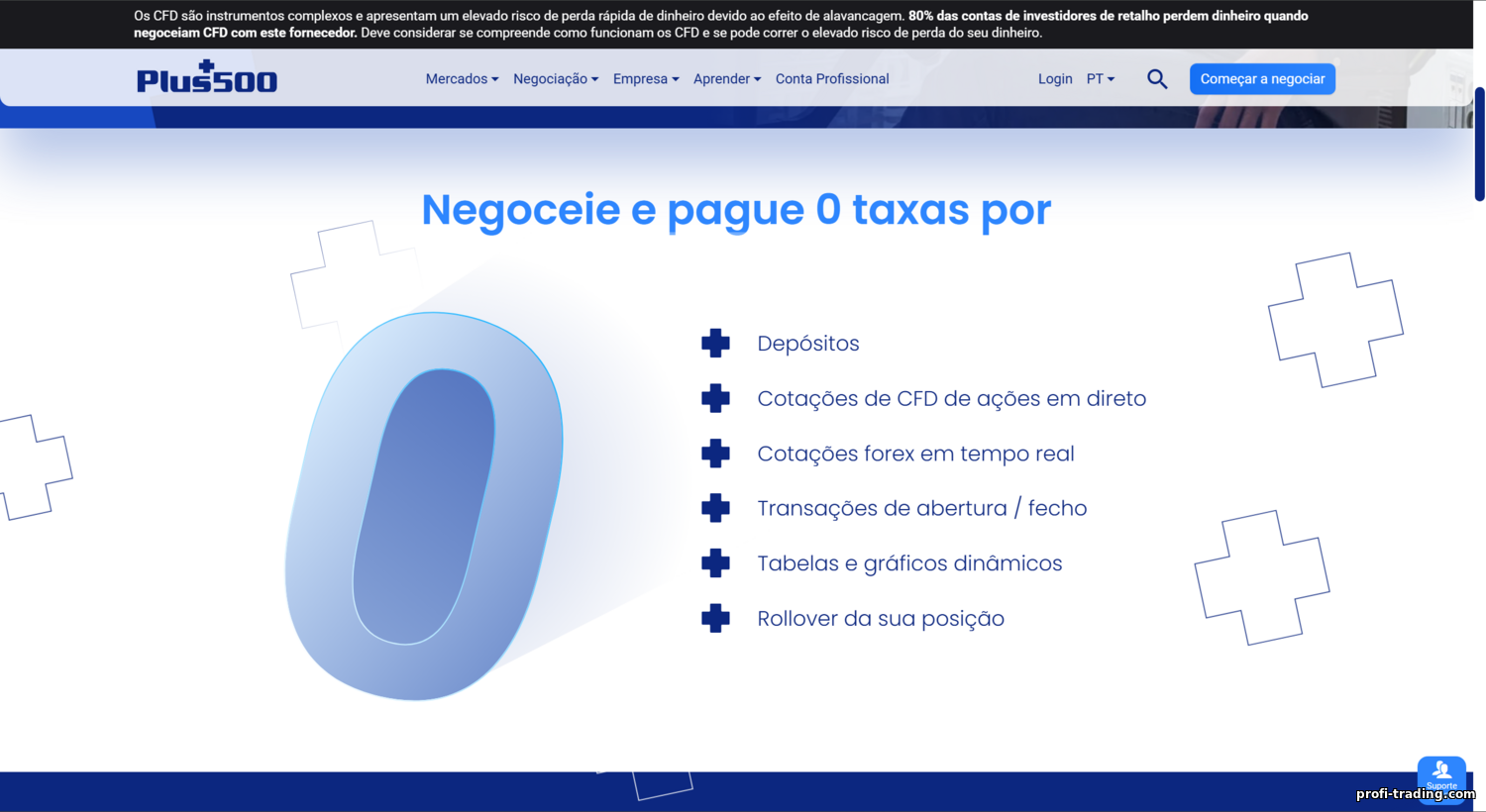 - Sem comissões por ordem. A corretora não cobra para abrir/fechar posições — a receita vem do spread. Também não há taxas de depósito/saque do lado da corretora (a Plus500 absorve custos de processadores). Você economiza, especialmente se opera com frequência.