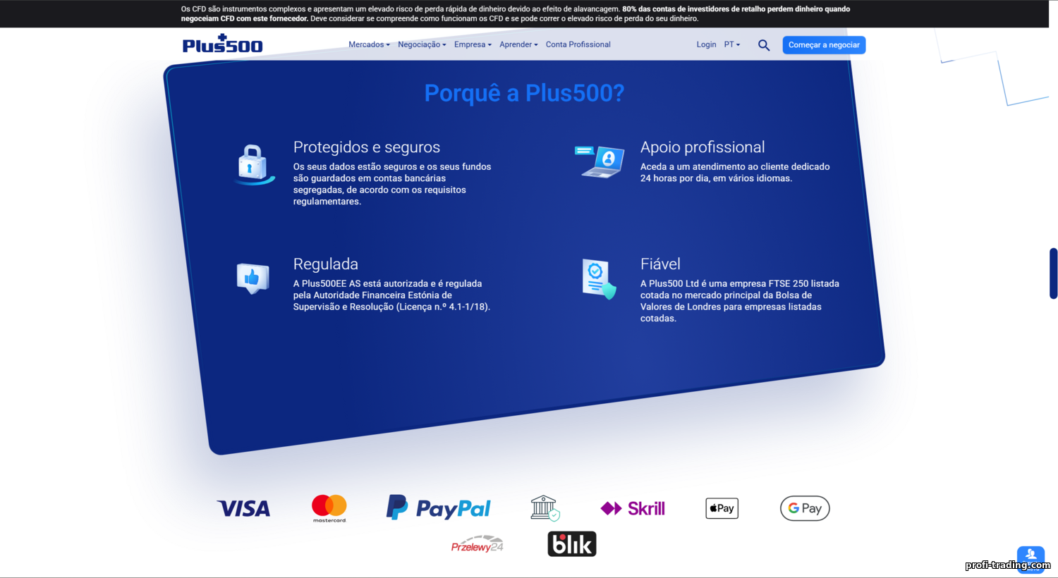 - Pagamentos móveis. Em algumas regiões, Apple Pay/Google Pay aparecem (no fim, baseados em cartão). No passado, depósitos cripto podem ter sido aceitos offshore, mas atualmente a Plus500 em geral trabalha com fiat.