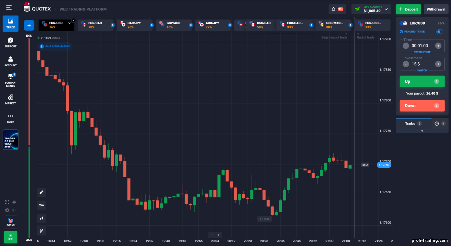 - Qual é o depósito mínimo e o valor mínimo por operação na Quotex? — Você pode começar a operar com apenas $10 na conta. O valor mínimo por operação é de $1. Essa barreira de entrada baixa permite testar a plataforma e aumentar o saldo aos poucos, sem assumir um risco grande logo de início.