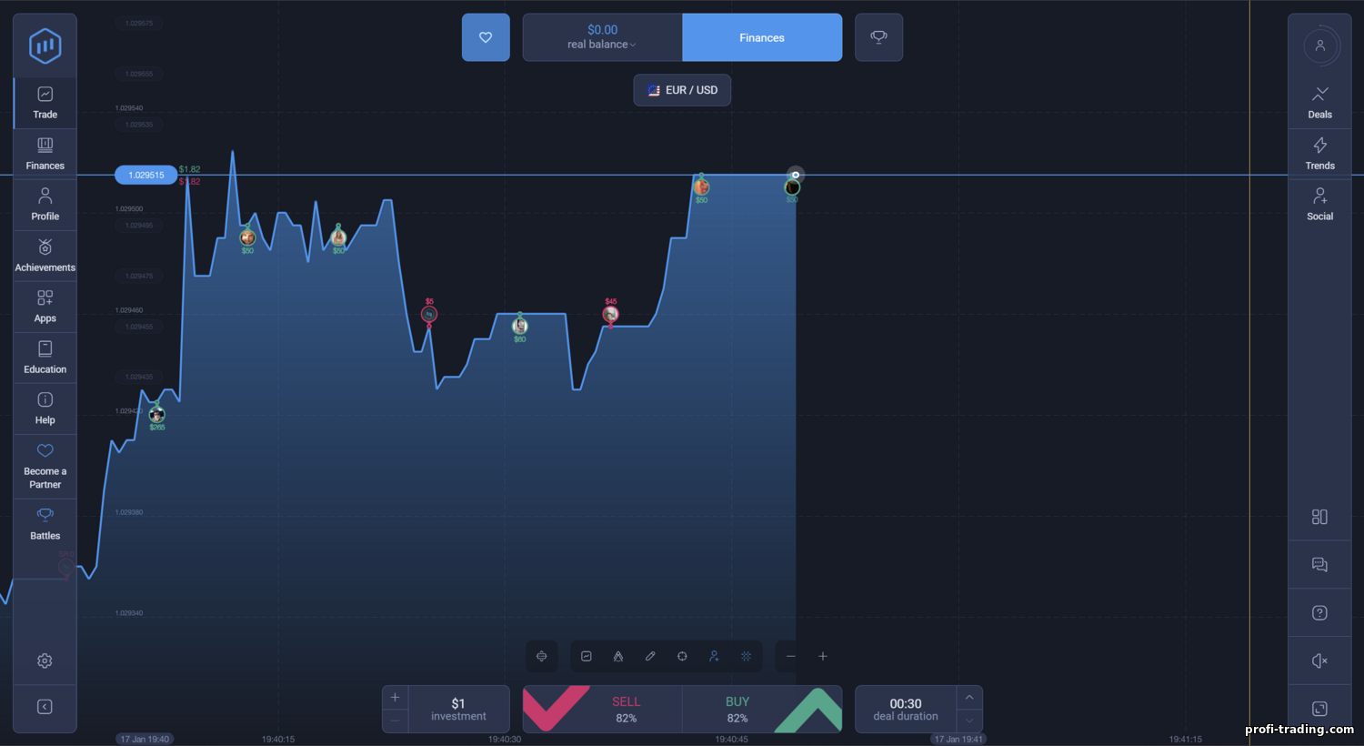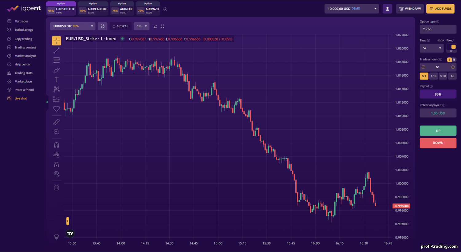 A Binomo é especialmente atraente para quem está começando por causa da interface simples e do baixo valor de entrada. A plataforma é bem conhecida nos países da CEI e oferece o essencial para dar os primeiros passos: conta demo, materiais de aprendizagem e suporte em russo 24/7. A Binomo realiza torneios para clientes com frequência e tem um app móvel com boas avaliações de usuários.