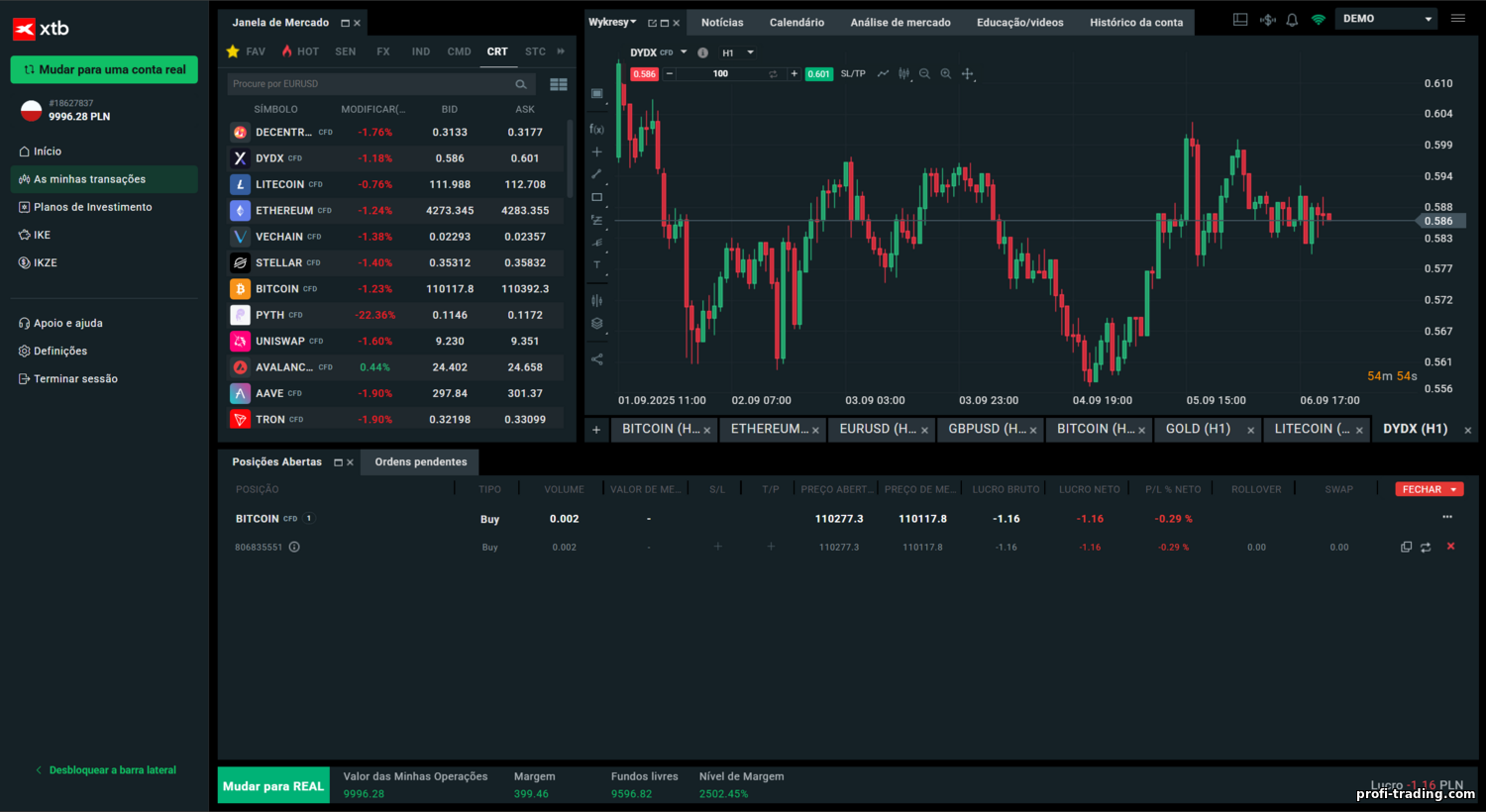 Resumo: a XTB enfatiza a simplicidade — uma conta principal para todos, com variante islâmica opcional. Isso ajuda iniciantes: registe‑se e negocie sem etapas adicionais. Traders avançados podem solicitar status profissional ou termos especiais. Existe demo (com tempo limitado). Eu sempre recomendo: teste na demo antes de operar ao vivo. A XTB dá 4 semanas — suficiente para aprender a plataforma e ensaiar uma estratégia.